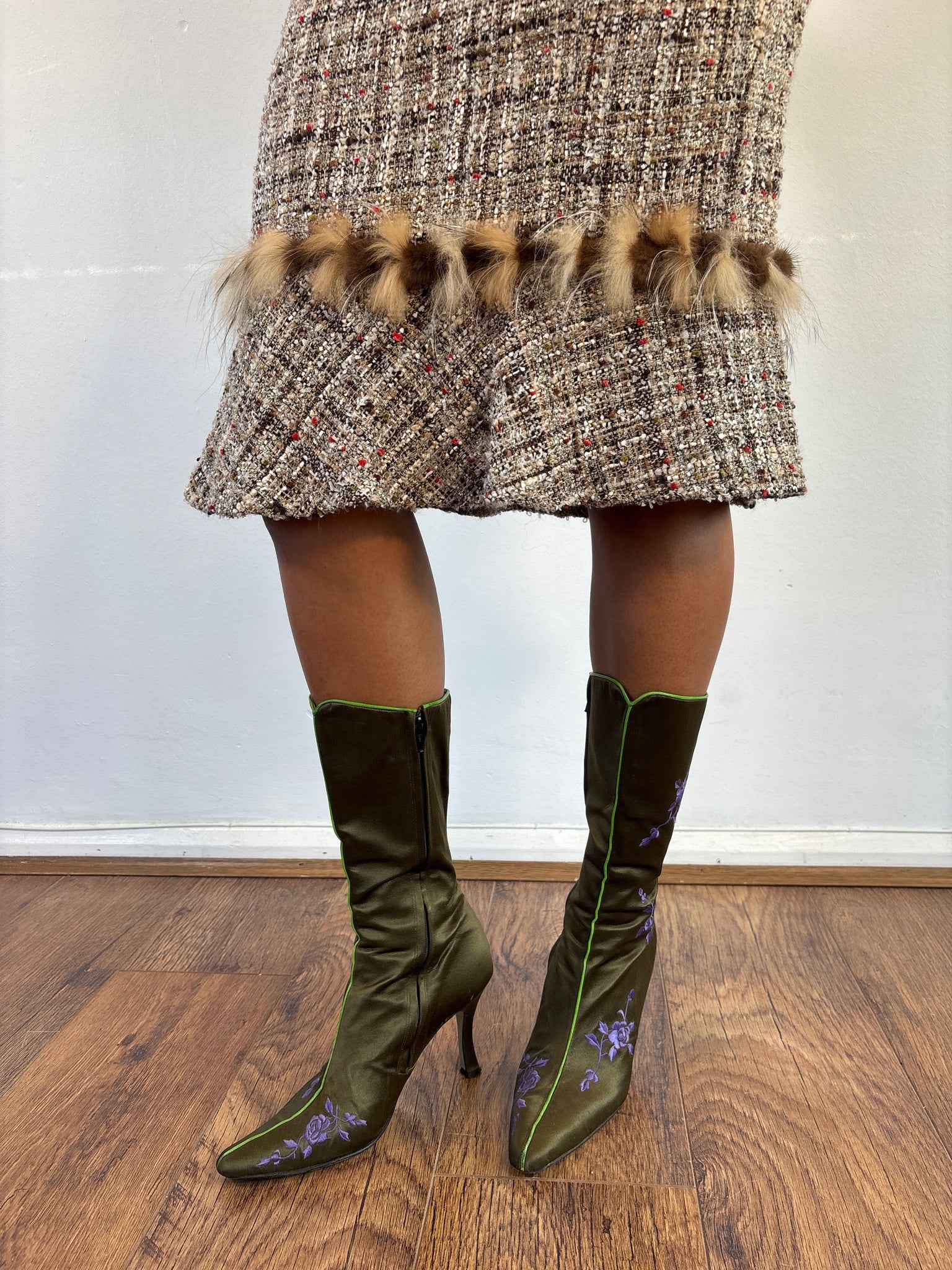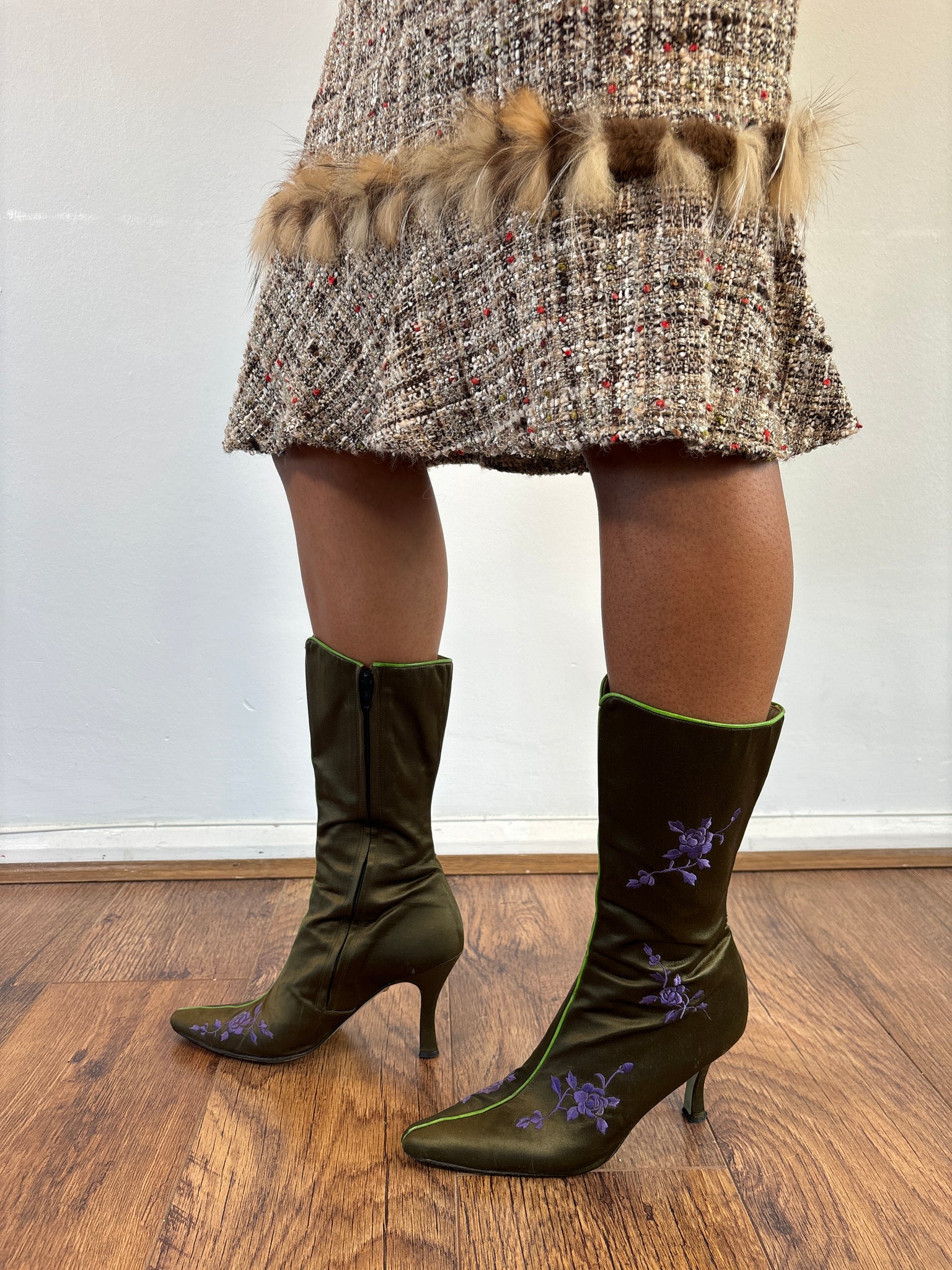 Paul Smith For Emma Hope Green Boots. Satin material embroidery Purple flowers with neon green seam. Pointed toes and side zips.