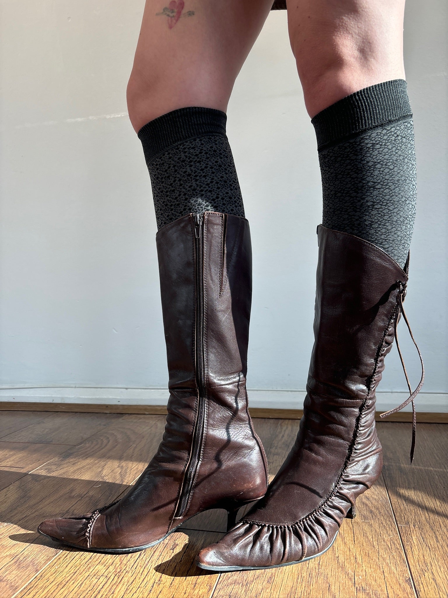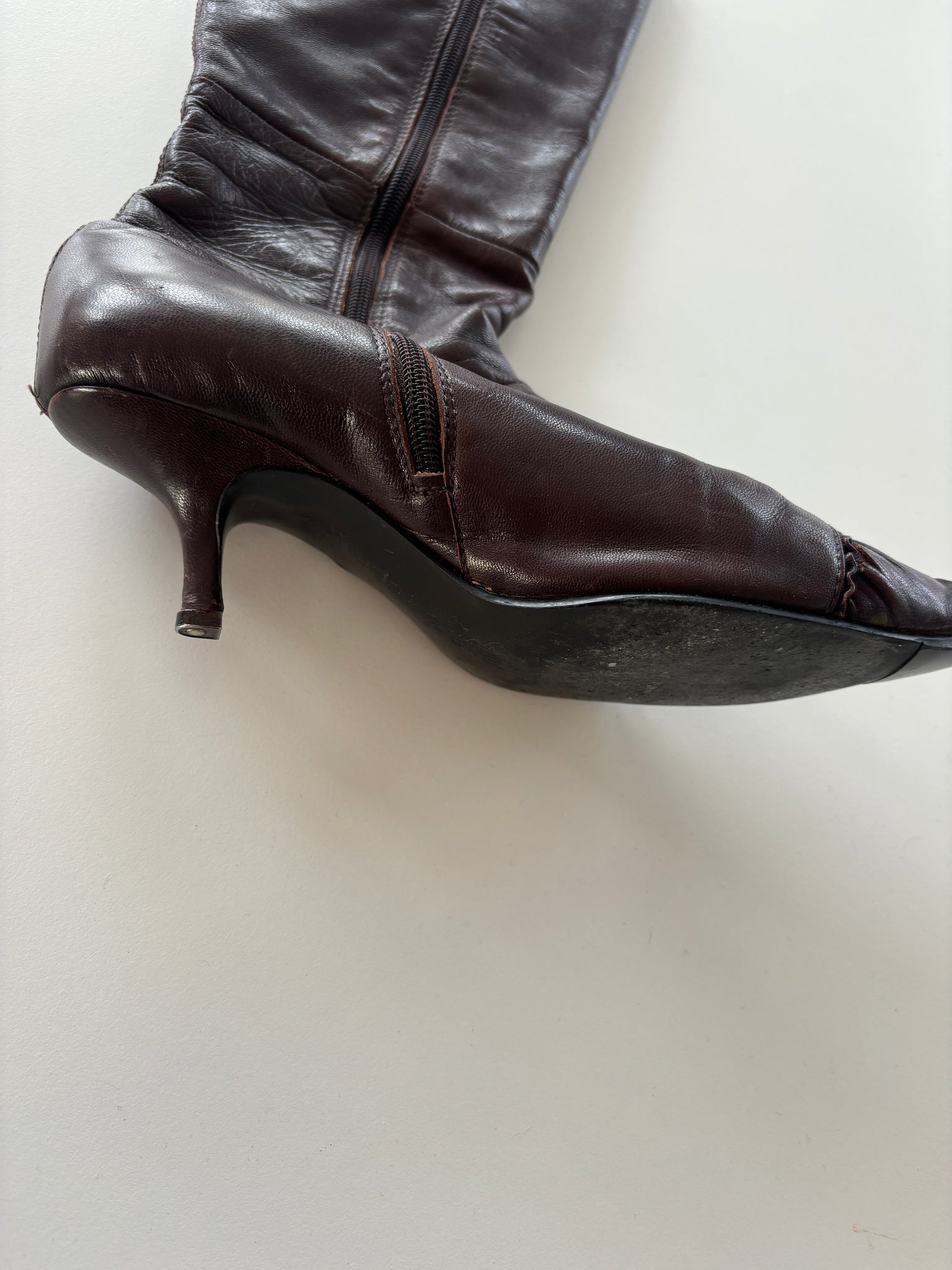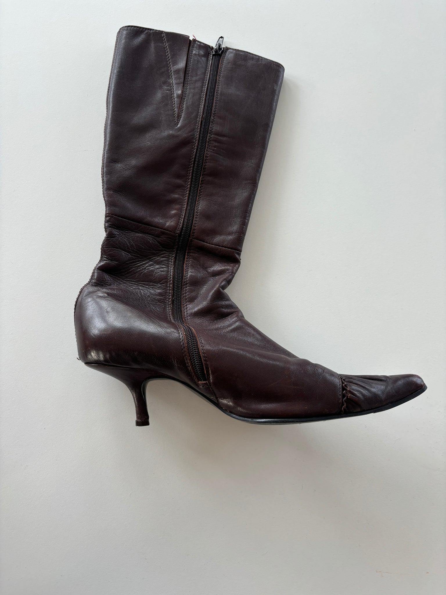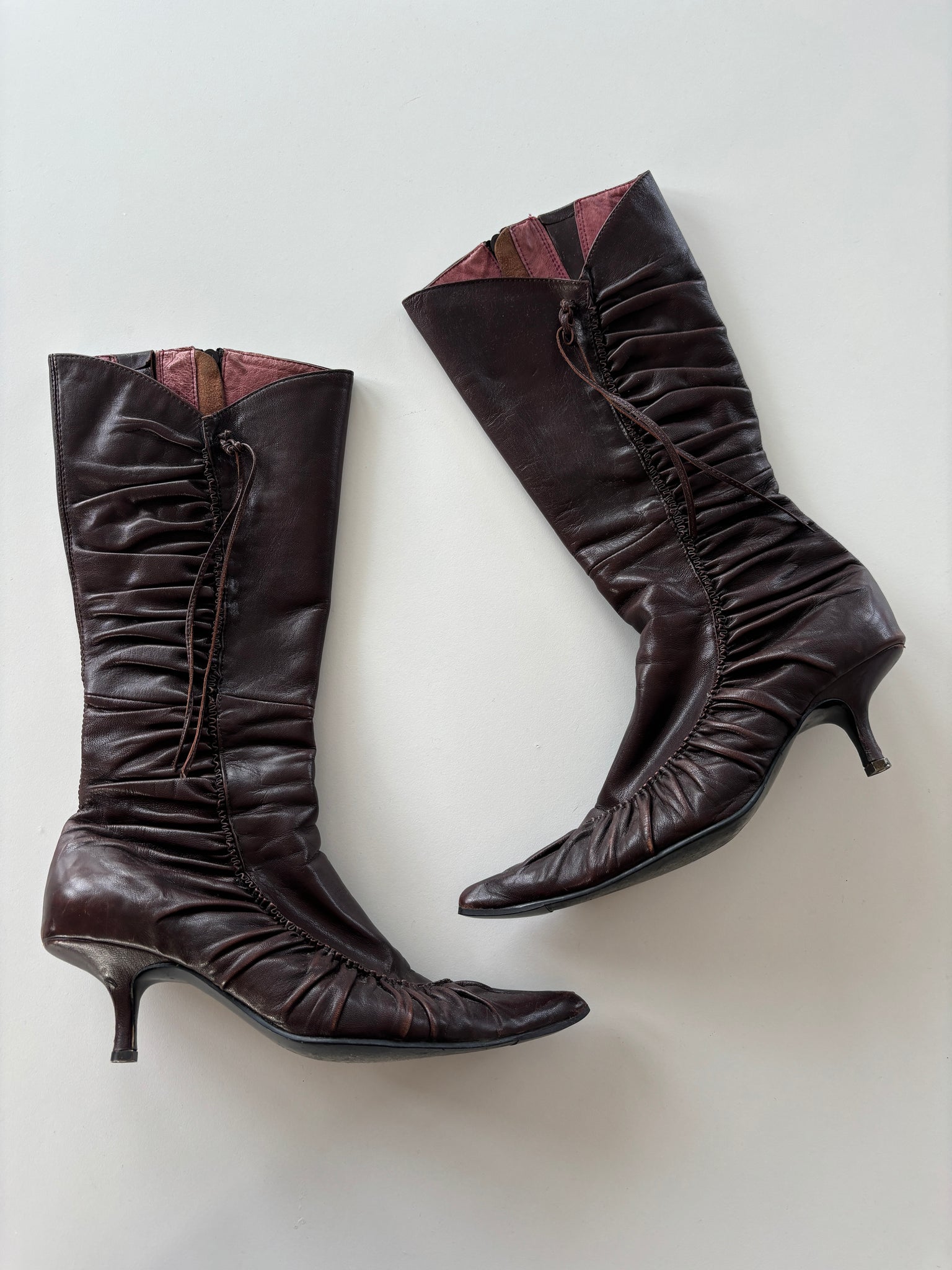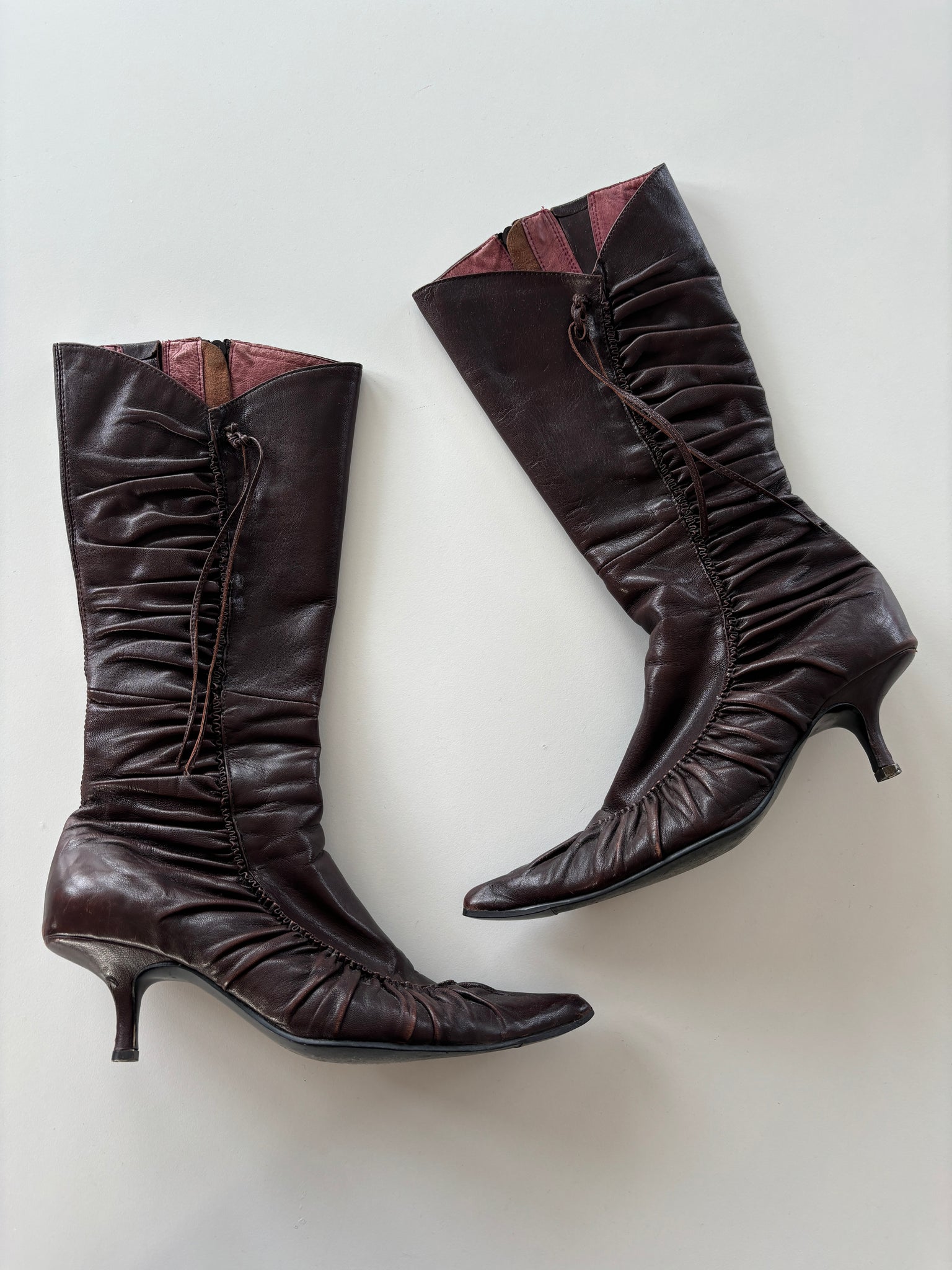 Vintage Y2K Brown Leather Pointed Rouched Boots