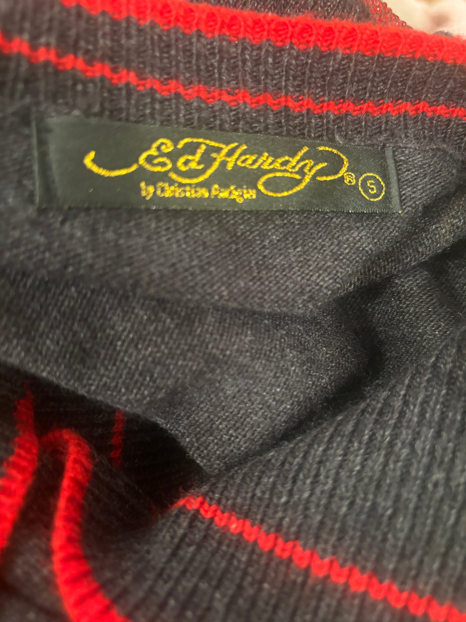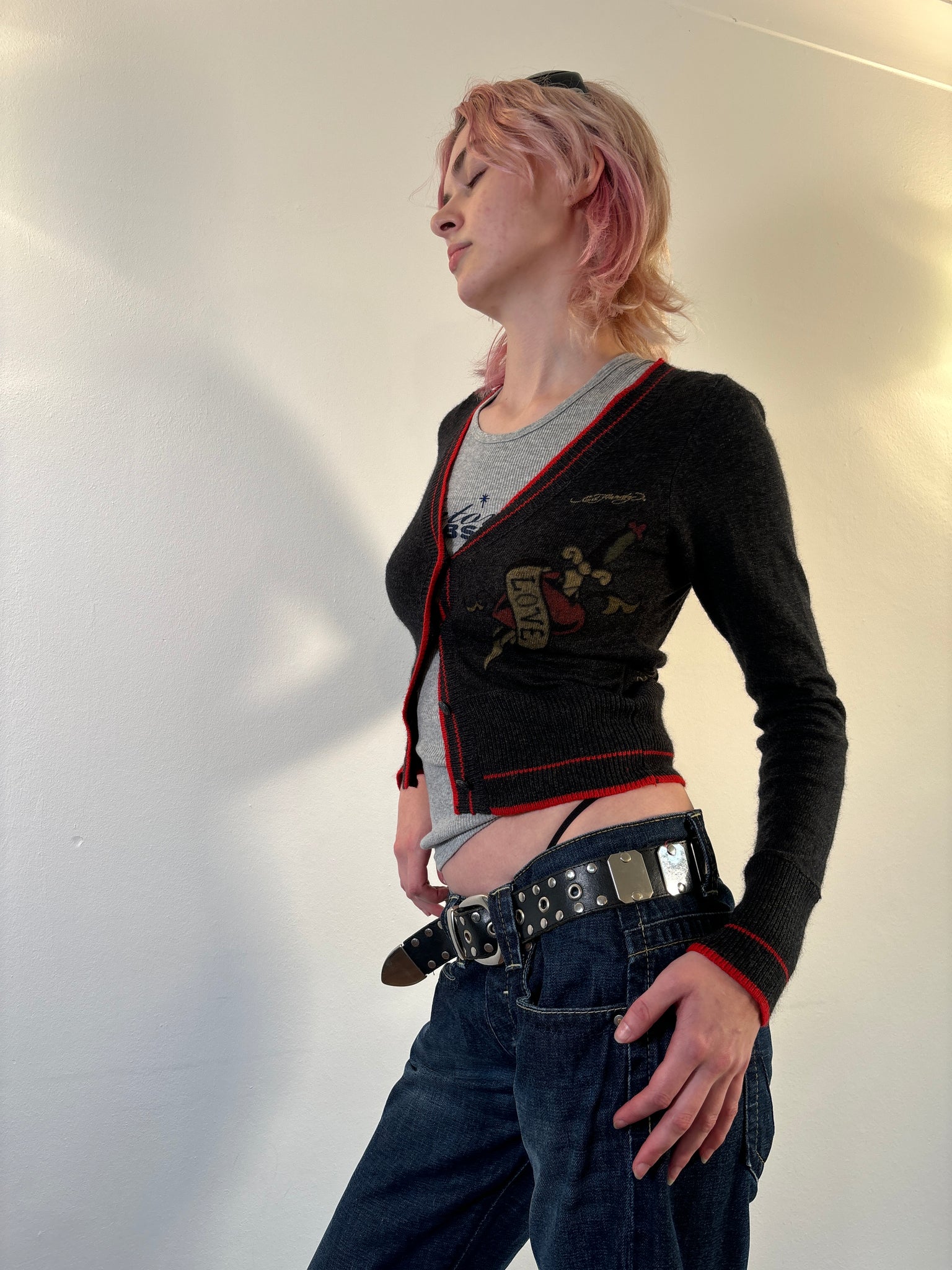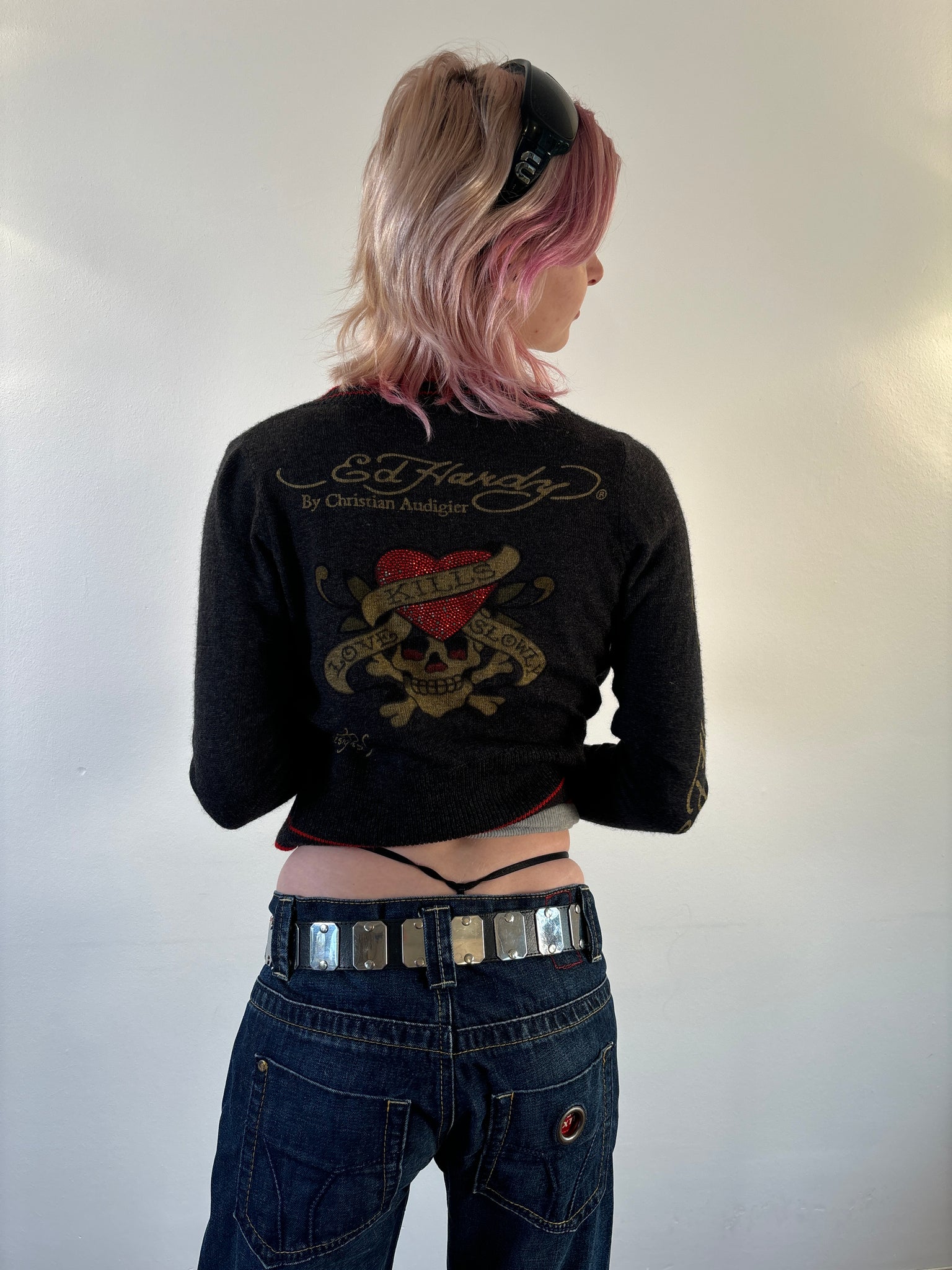 Vintage Y2K Ed Hardy Knit Grey Diamante Skull Cardigan