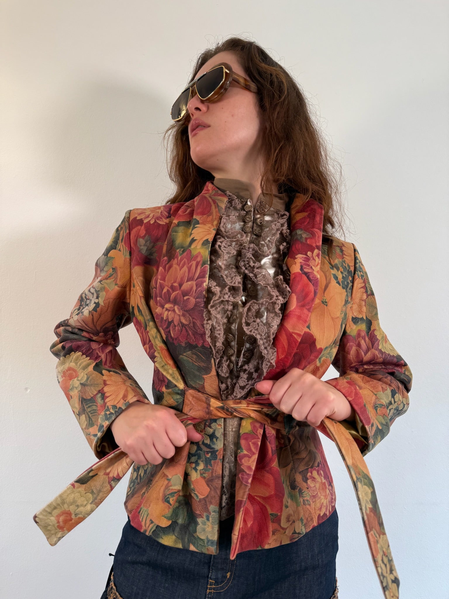 Vintage Y2K leather flower print jacket. So good ! Had a tie fasten. Bought in California. Looks great with split hem trousers.